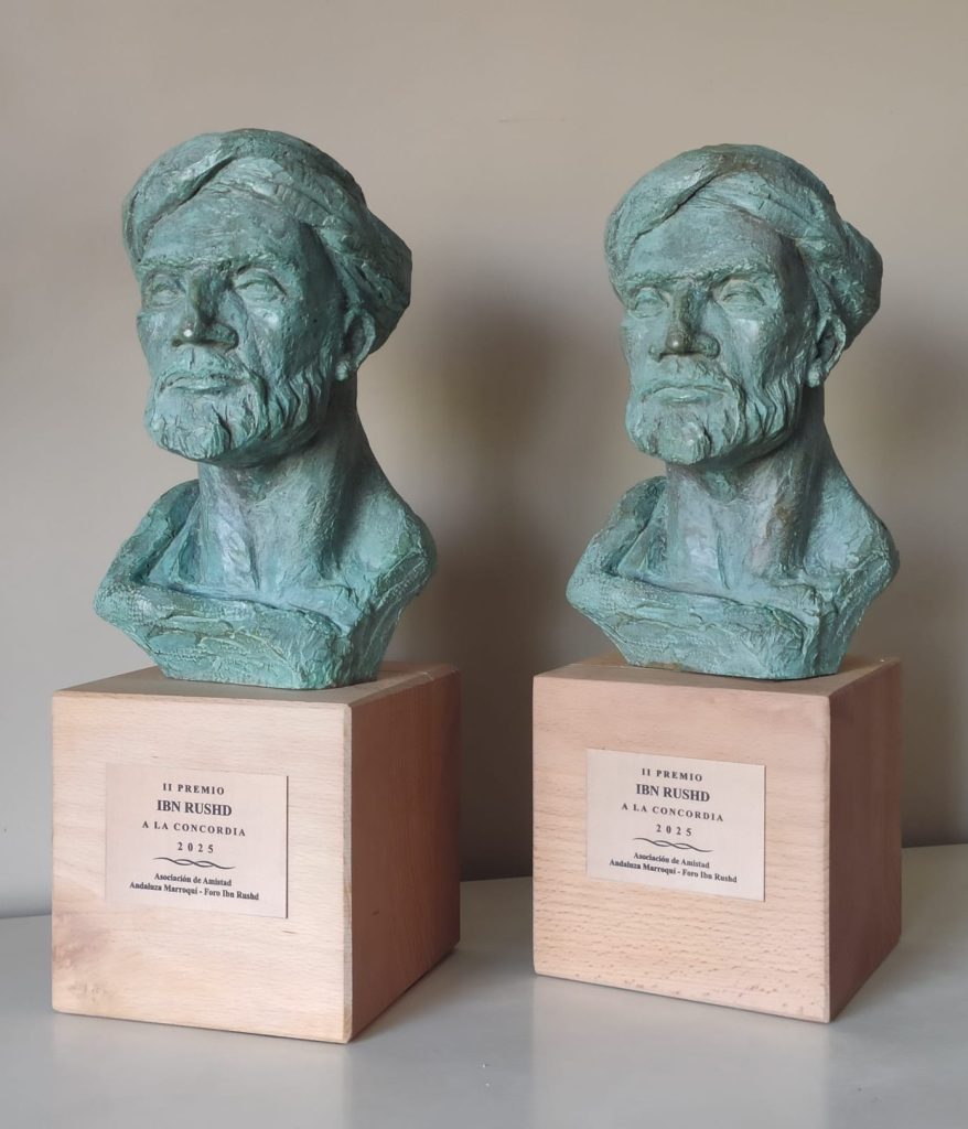 EL PREMIO IBN RUSHD DE LA CONCORDIA, impulsado por la Asociación de Amistad Andaluza Marroquí – Foro Ibn Rushd y patrocinado por la Fundación Baleària, se plasma en una escultura del escultor cordobés Luis M. García con el busto del filósofo andaluz Ibn Rushd, también conocido como Averroes, cuya          figura histórica encarna los valores de convivencia, libertad, interculturalidad y fomento del diálogo que defienden sus promotores.